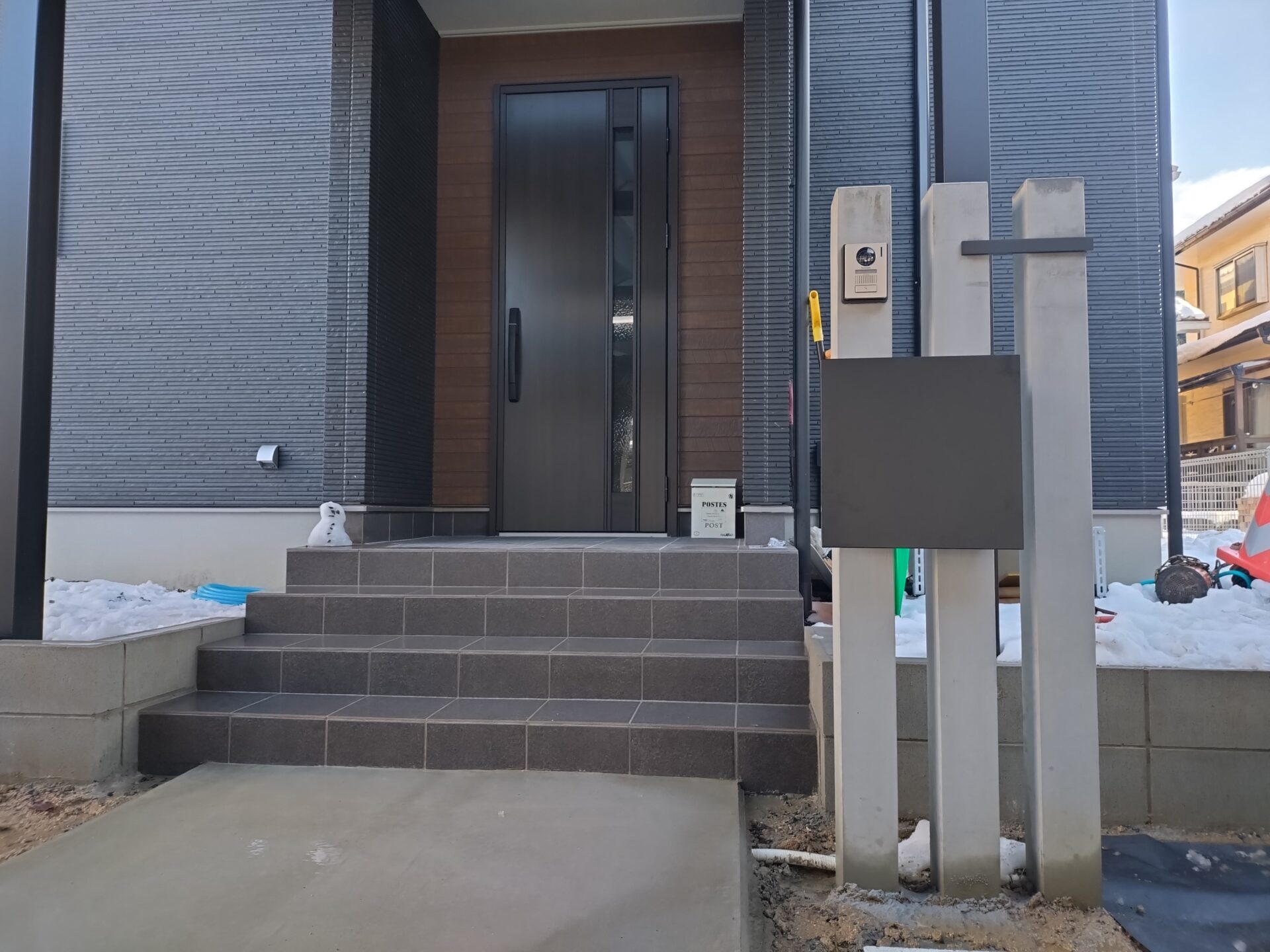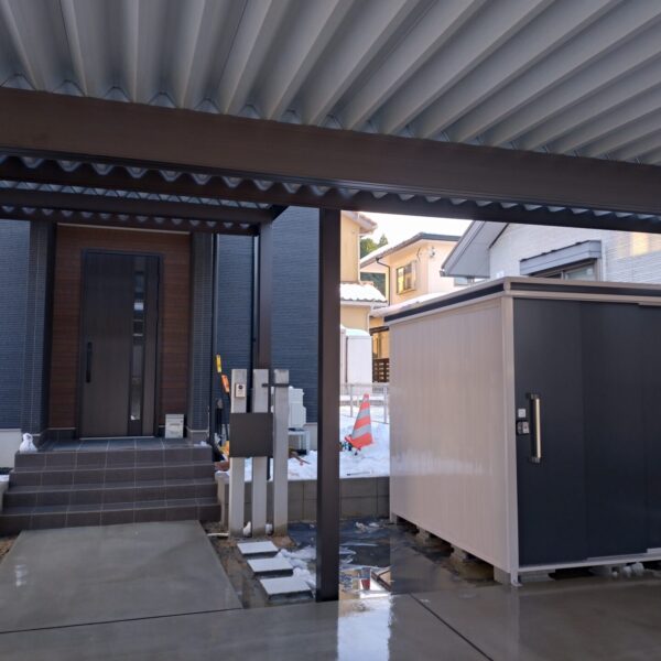 門柱にポストをプラスし、玄関前に物置を配置することで、機能的な外構となりました。