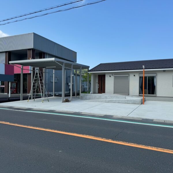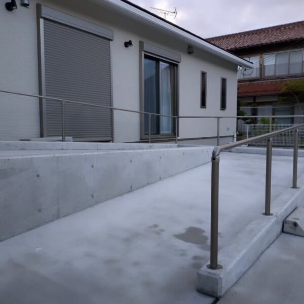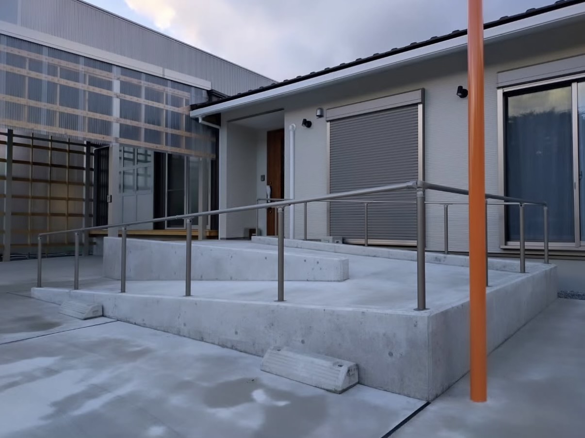 玄関へと続くスロープを設けることで、車椅子でも使いやすい外構となりました。カーポートへとつながるスムーズな動線と、全面土間コンクリート仕上げにより、ゆとりある駐車スペースを確保しました。