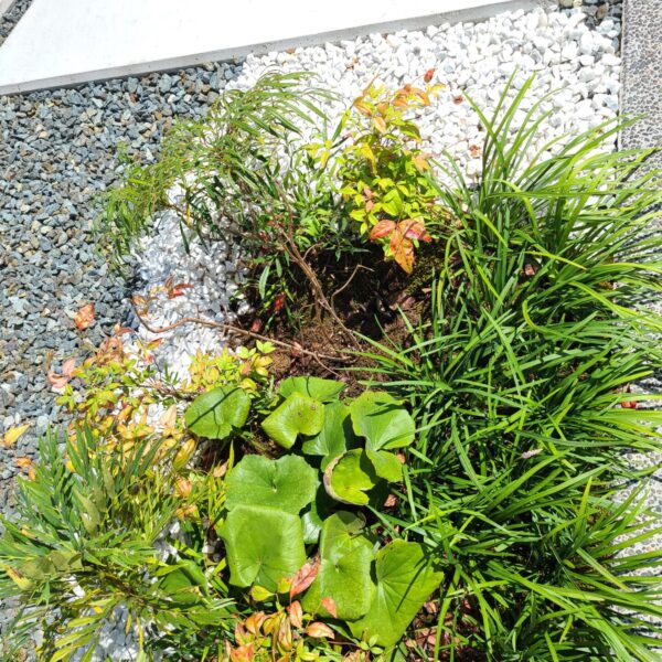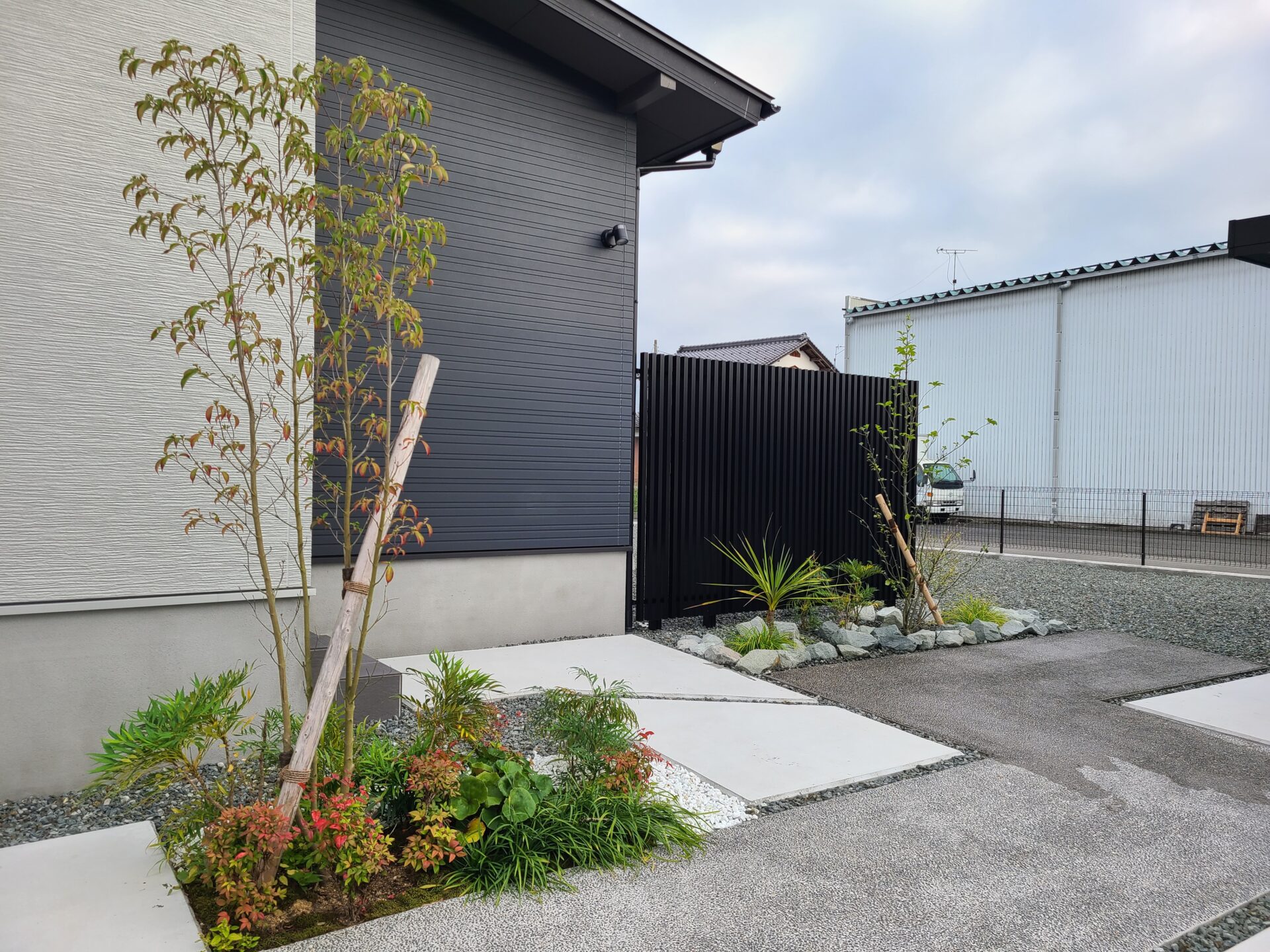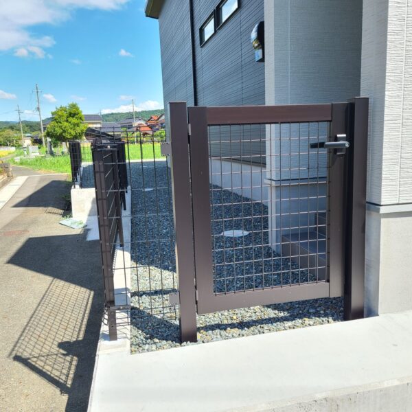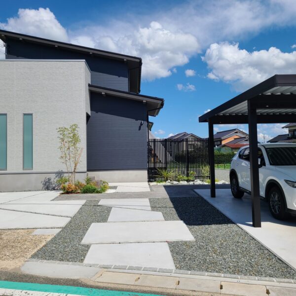 アプローチ空間には、グレーの洗い出しと、土間コンクリートを組み合わせ、落ち着いた色合いが全体に統一感をもたらしています。門扉とメッシュフェンスを取り入れ、防犯性と機能性を両立した外構に仕上がりました。