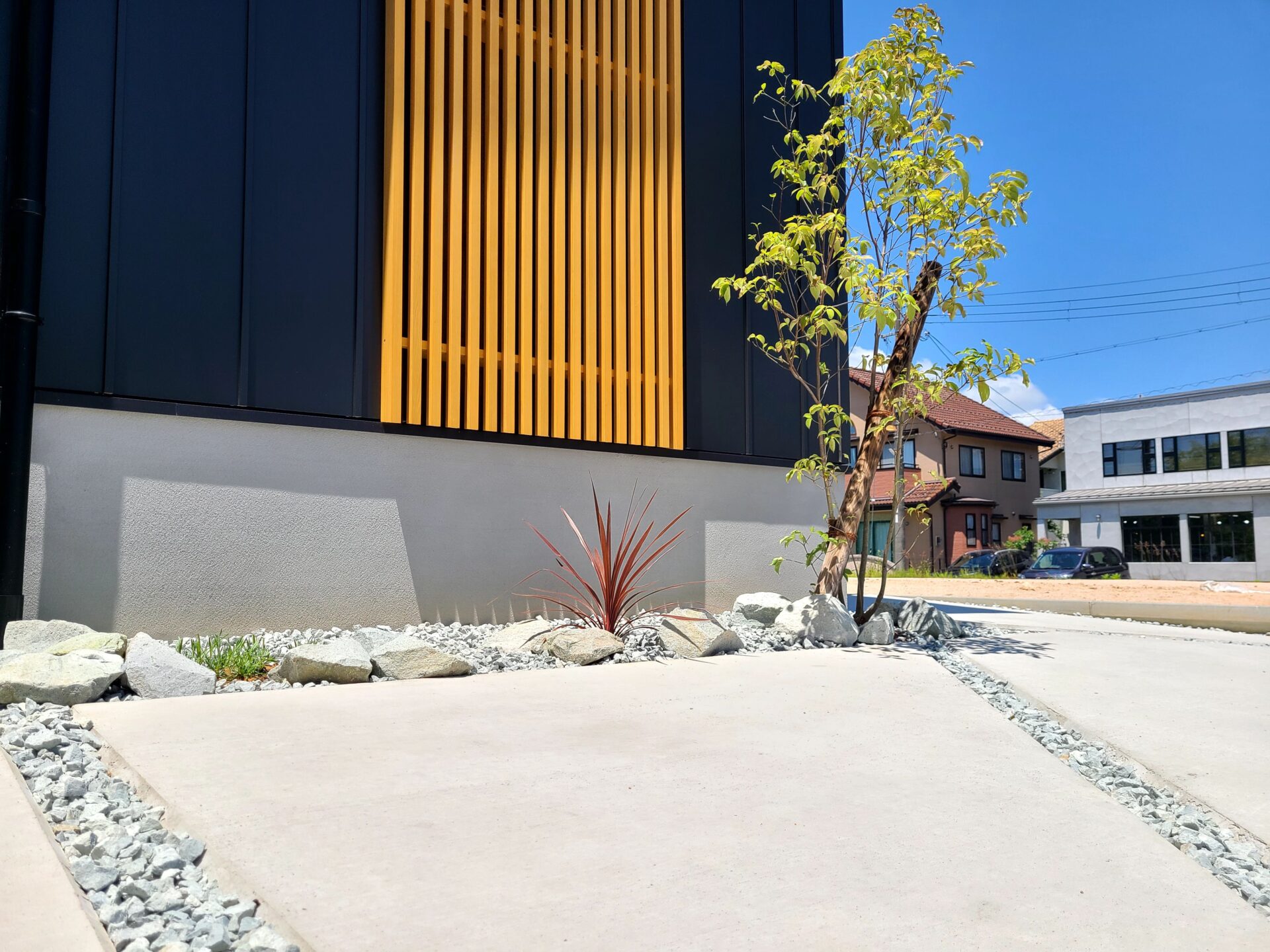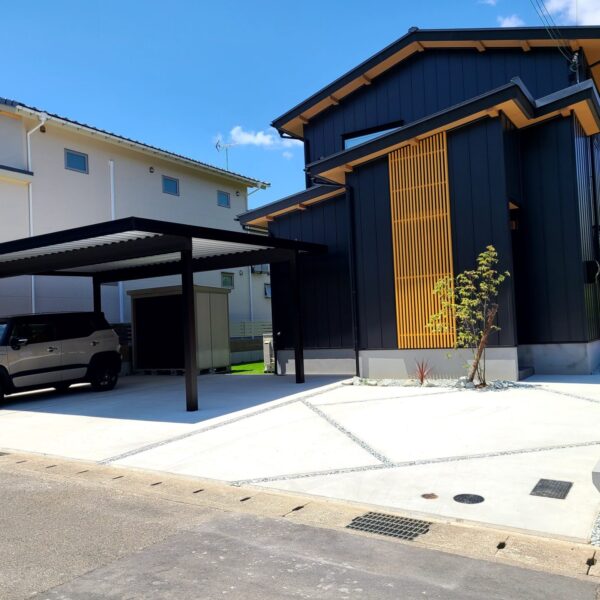駐車場はシンプルなデザインの中に、個性を感じられるスリットアプローチに仕上がり、土間コンクリートの白と、お施主様が張られた人工芝のグリーンがさわやかな空間に仕上がりました。リビングからも景色を楽しめ、みずみずしい緑に癒されるお庭となりました。