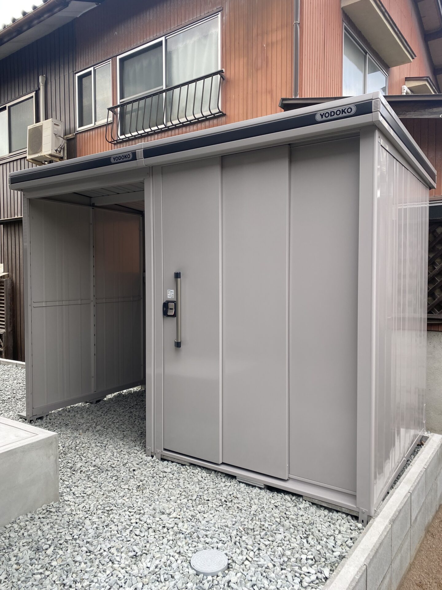 大容量の物置には自転車も収納でき、機能性と利便性を兼ね備えた外構となりました。
